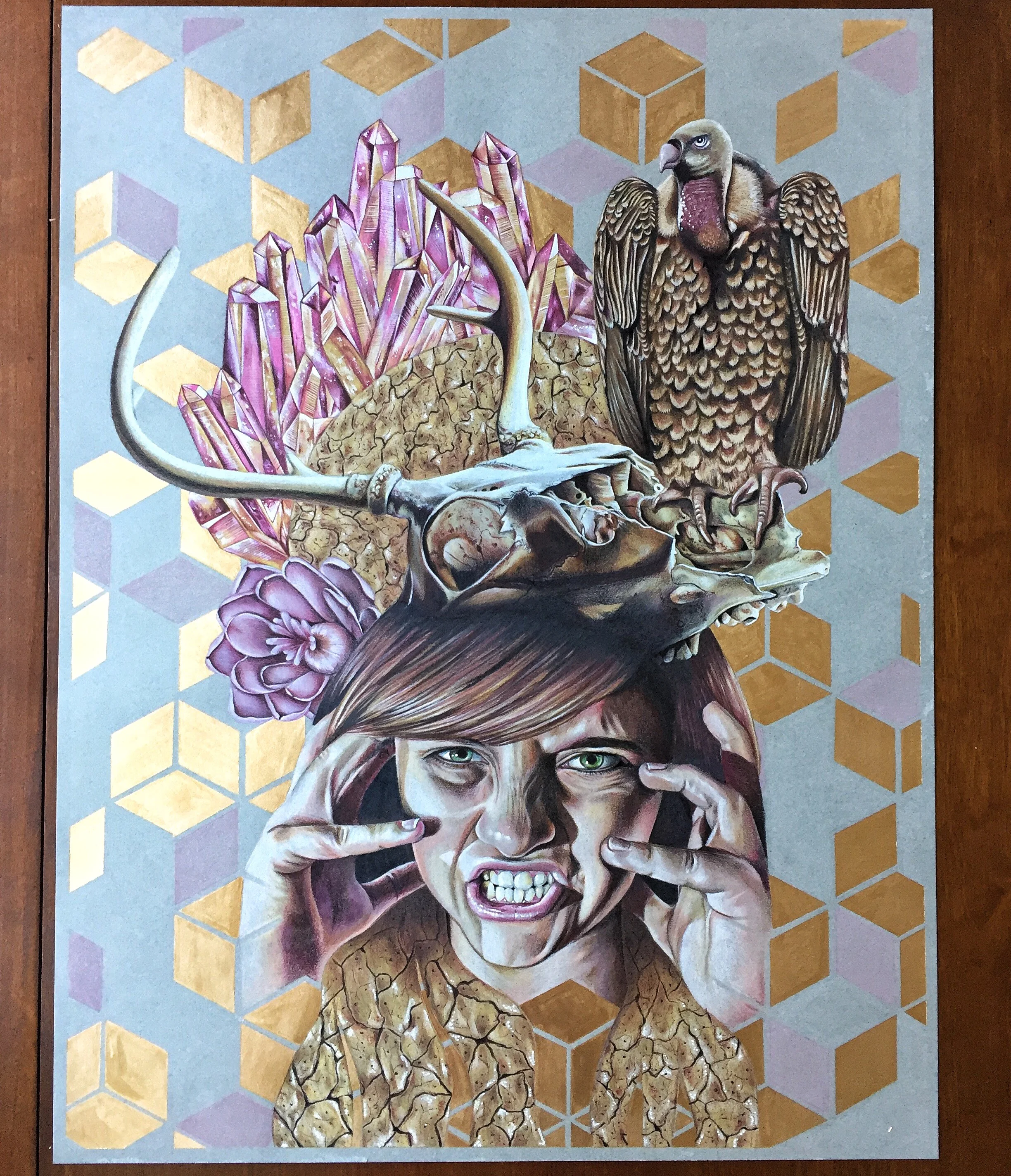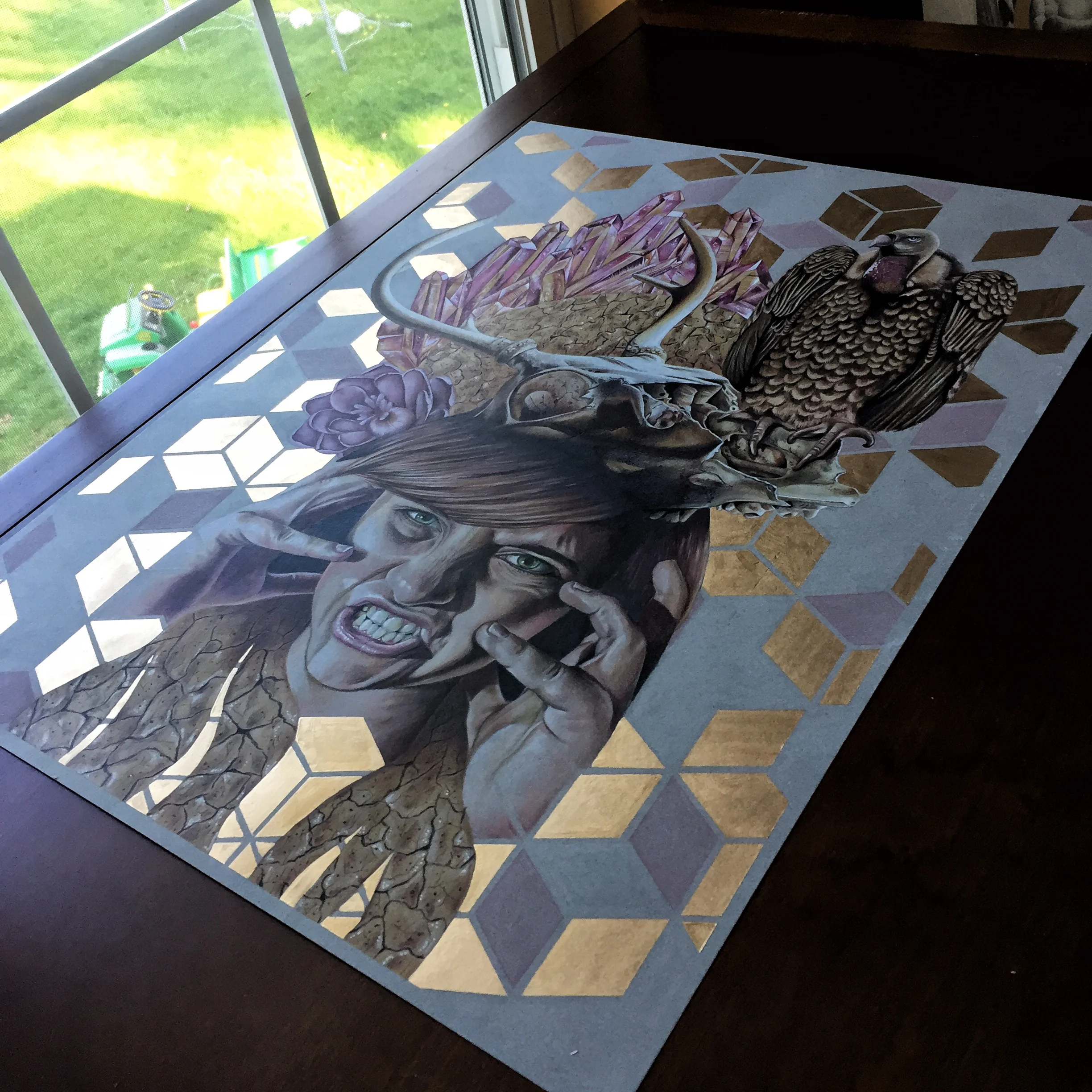 This piece is 19" x 25" and completed in Prismacolor Colored Pencils, Copic Marker, and Gelly Roll Gel Pen on Strathmore 400 series Toned Tan paper.