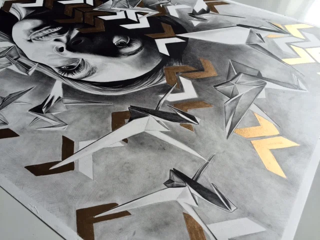 This piece is 18"x24" and completed with Caran D'Ache Graphite, Martha Stewart Gilding Paint, on Strathmore 400 series paper.