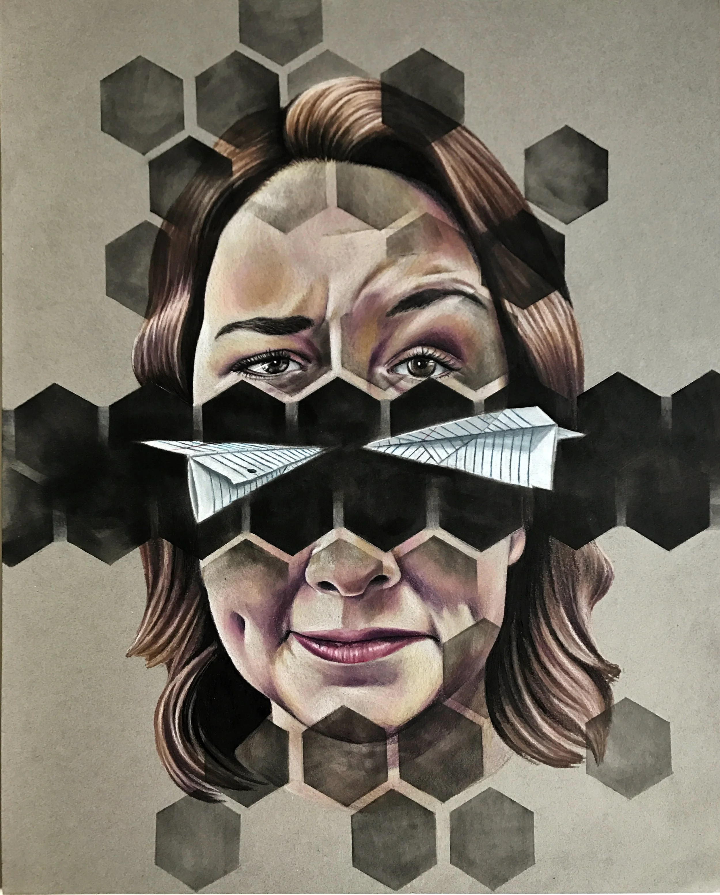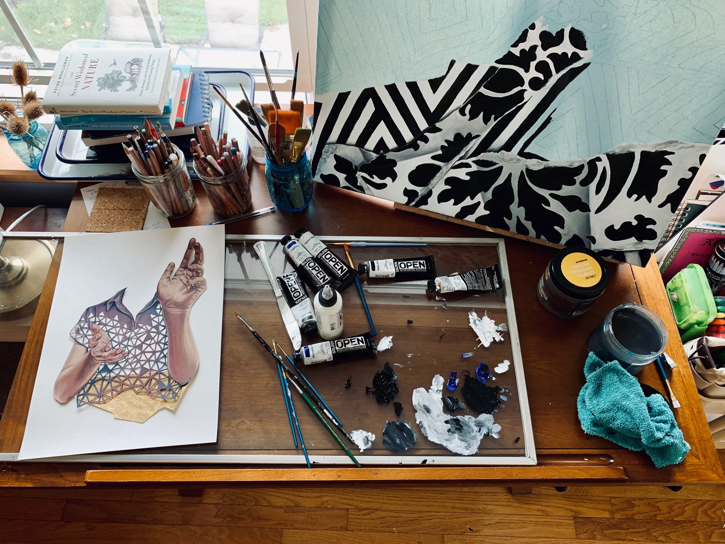 My torn patterns in ballpoint pen and watercolor fulfills my desire to make work about the layers of contradiction in everyday life; the balance between bold and delicate, and the predictable nature of pattern that is broken into chaos when it is torn and folded.  Then I have my colored pencil hands that I have been cutting apart and collaging with gold leaf and more patterns. They are representative of the ways in which our pieced together experiences propel our lives forward. Then there is my Heroes for Her series, born from my need as a mother to provide my daughter with a narrative to discuss worthy role models, people whose first profession isn’t Instagram Influencer or YouTube celebrity.  I’m all over the place, but at the same time, very much me.