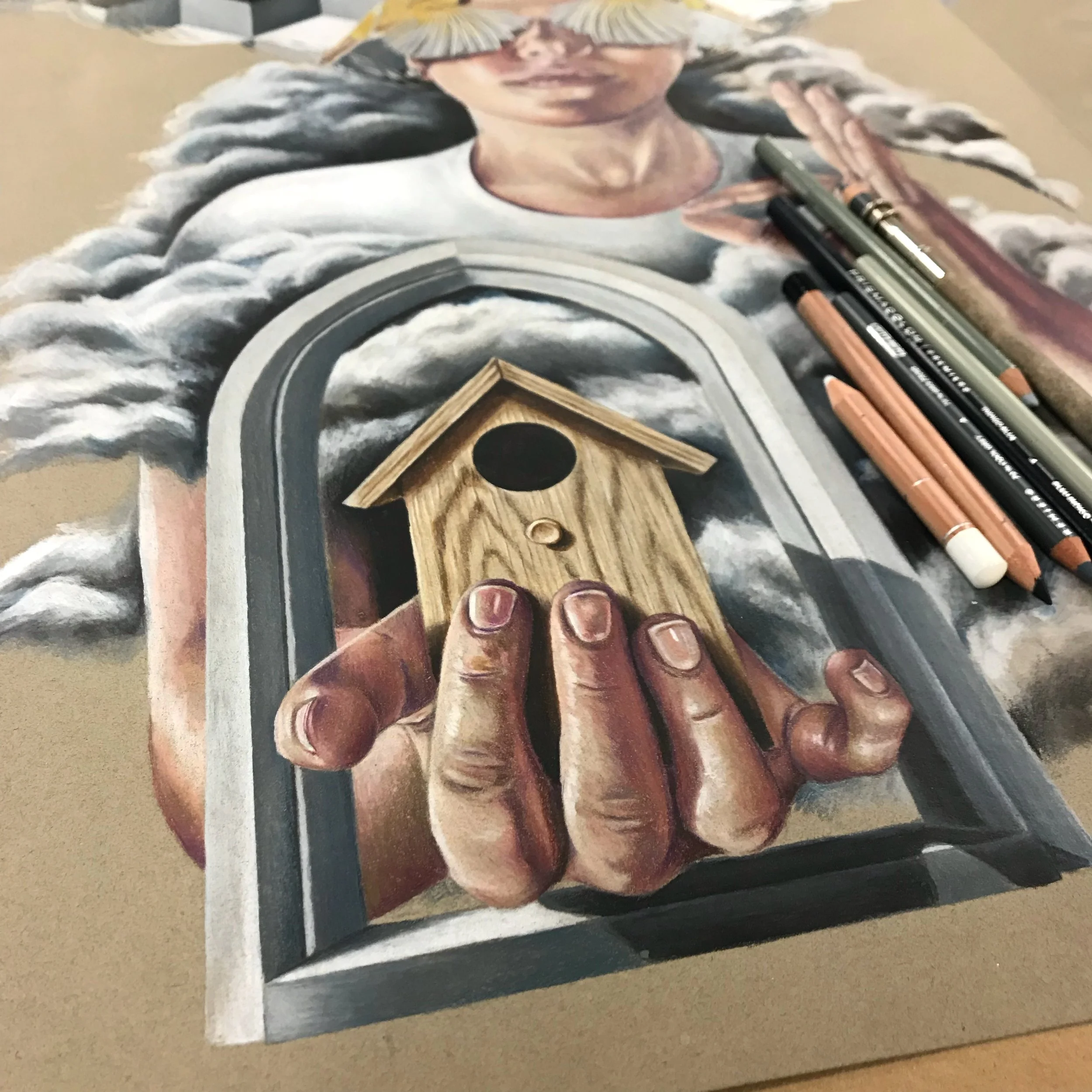 Blind Faith | 2017, Prismacolor and Caran d'Ache Luminance Colored Pencil, Pan Pastel, Le Plume Maker on Strathmore Artagain Grey Paper.